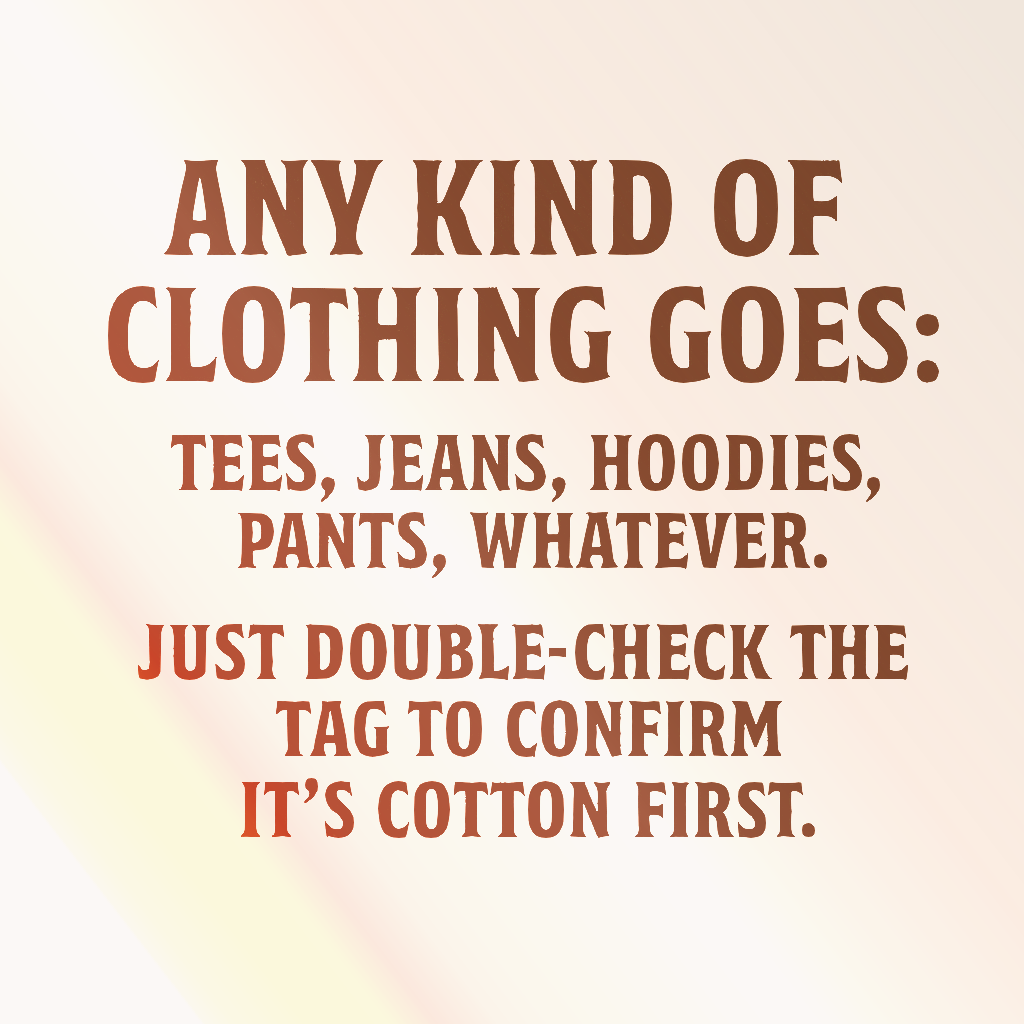 Before sending anything in, please double-check the garment tag to make sure it’s 100% cotton.